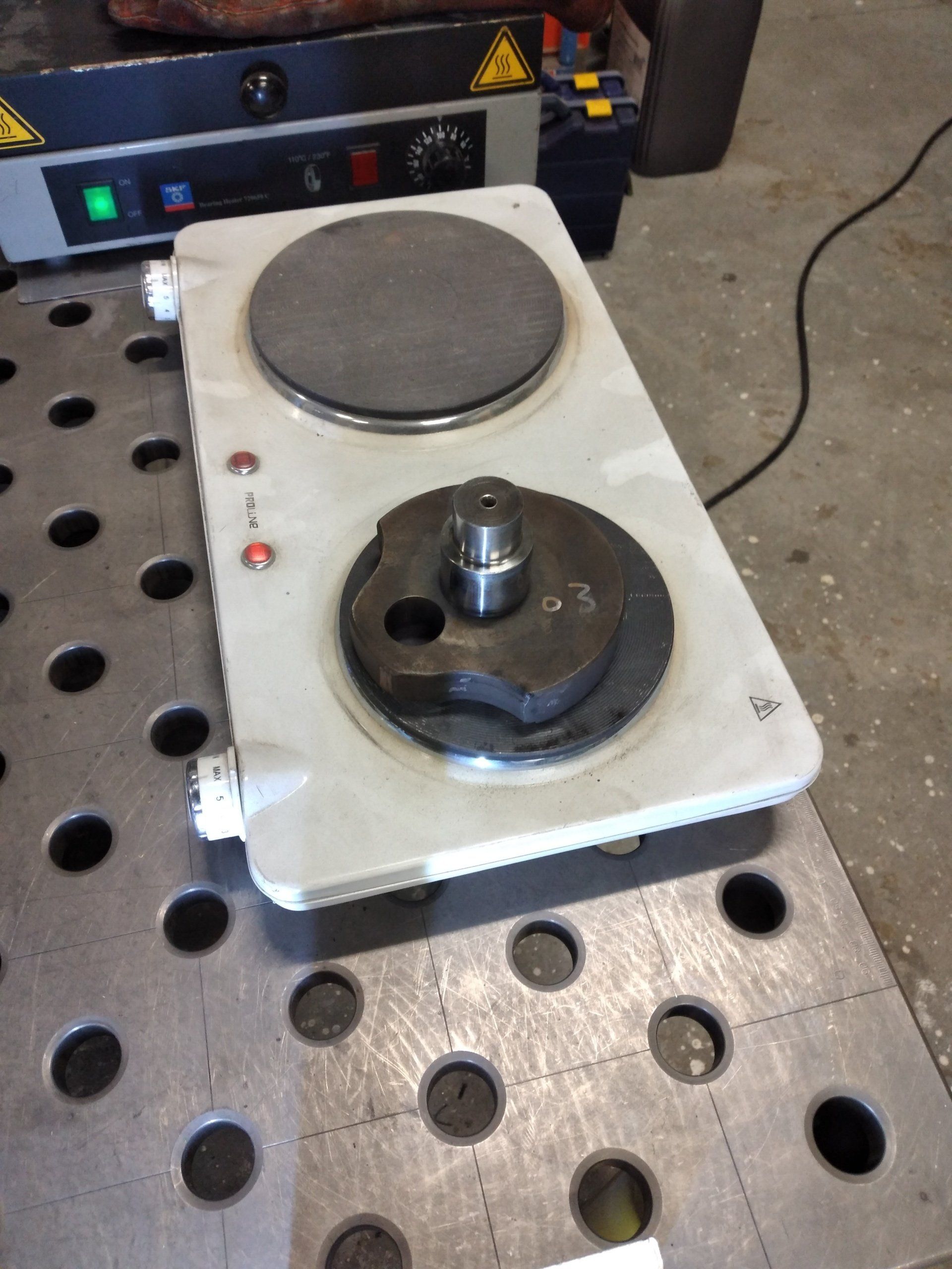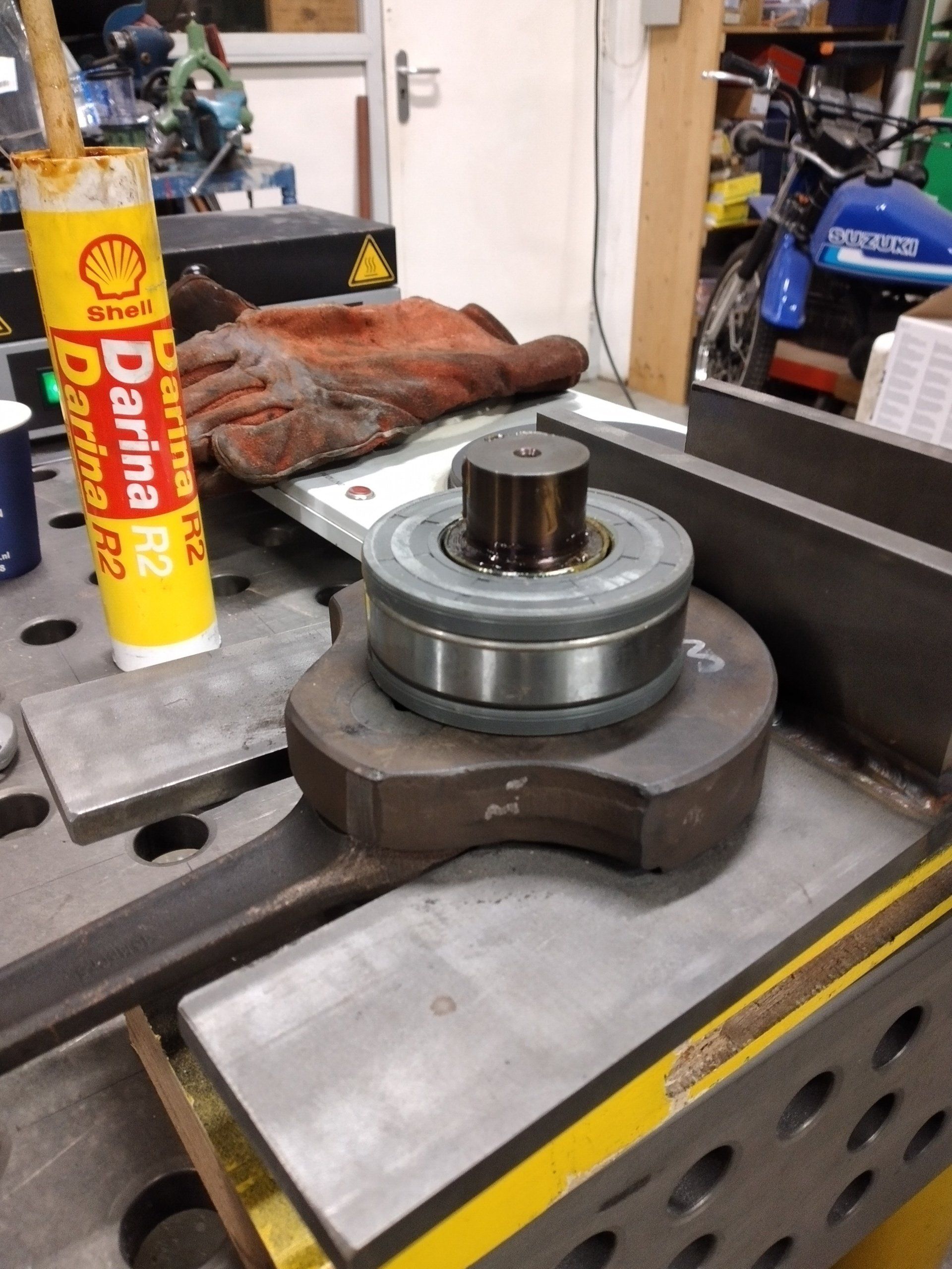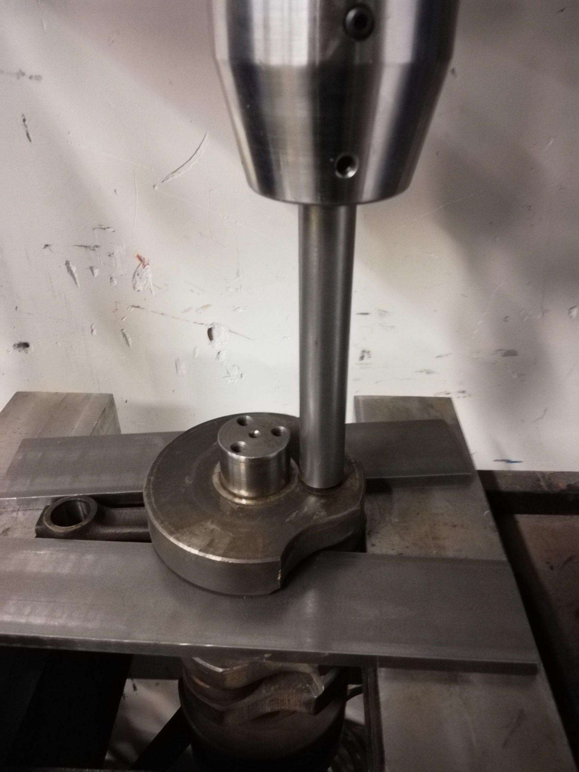 Nou zo gezegd zo gedaan, de lagers met keerringen gemonteerd. En je zal het net zien alle lagers en krukaswangen gingen goed en bij de laatste wang drukte we 1 keer teveel op de pers en de drijfstang zat vast. Probleem, want om die weer los te krijgen moesten we de hele krukas eigenlijk weer uit elkaar halen waarbij misschien de lagers weer kapot zouden gaan. Laten we daar nou net geen zin in hebben. Met veel moeite en een gebroken lagerpers verder toch gelukt om de krukaswang los van de drijfstang te krijgen.