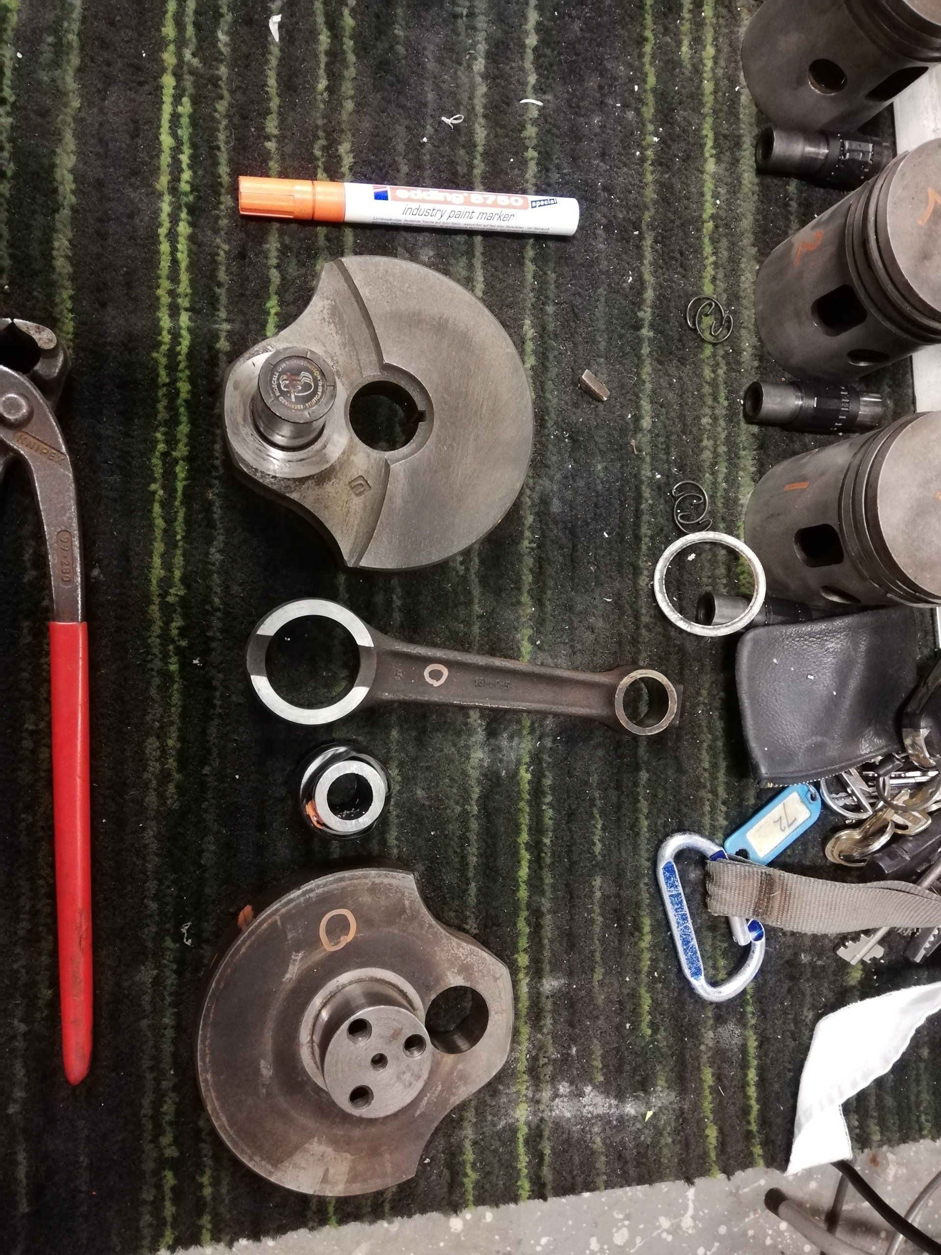 Lagers binnen, krukas verder uit elkaar geperst nadat die goed was gemerkt zodat die weer op dezelfde manier in elkaar gezet kan worden. Tijdens het uit elkaar halen van de krukas kwamen we er achter dat de lagers blijkbaar niet allemaal dezelfde zijn. De voorste en de achterste en de middelste waren anders. Dus weer verder zoeken naar de juiste lagers. Na echt lang zoeken, bellen en informeren geen resultaat, misschien laten maken maar dat zou best gaan oplopen met de kosten. De buurman zou er nog s goed over nadenken of er geen andere optie te verzinnen was. Hij wilde iets proberen maar wist niet helemaal zeker of dat ging lukken. Hij wilde normale lagers bestellen en aan weerskanten een keerring zodat de compressie behouden bleef bij de cilinders. Niet geschoten is altijd mis zeg ik dan maar.